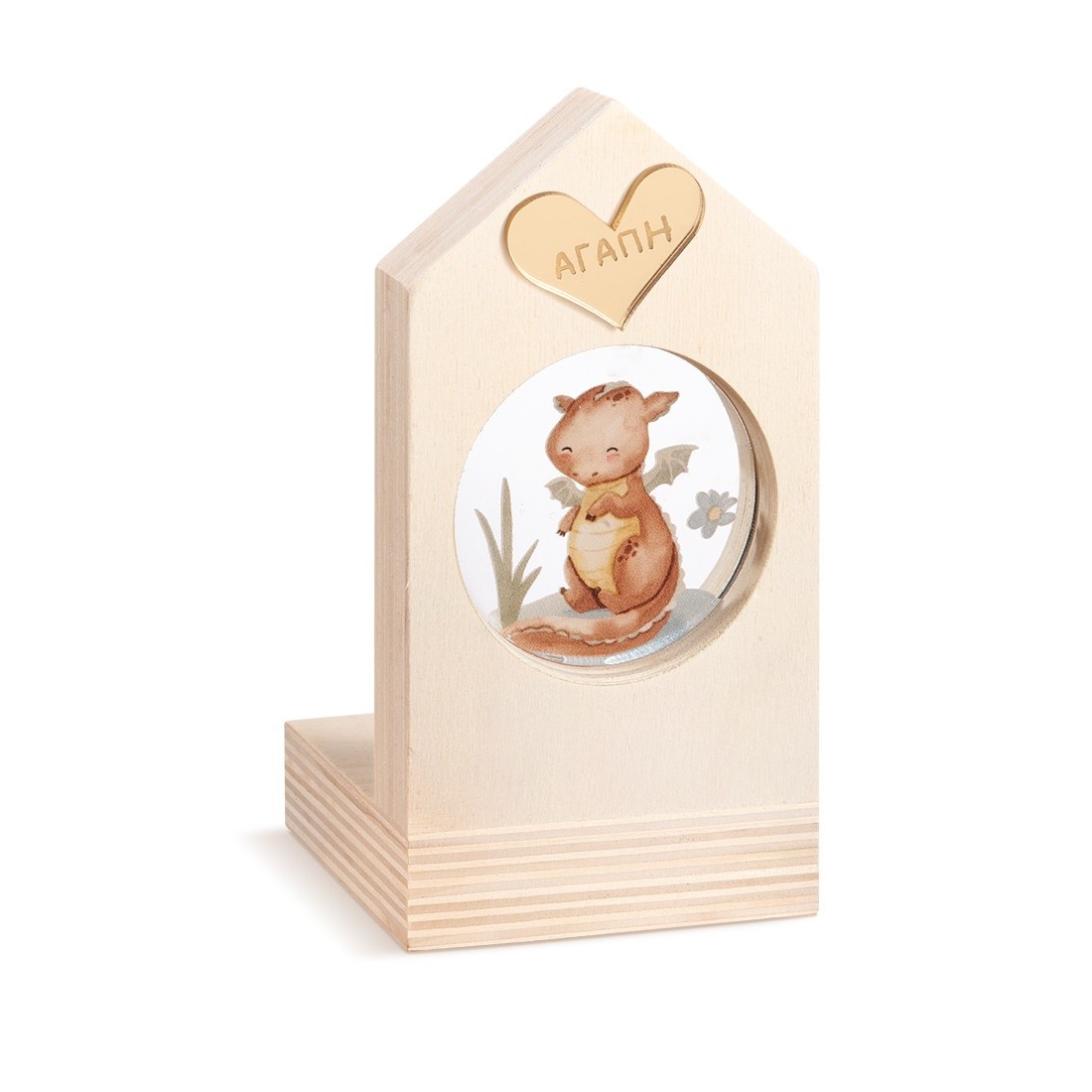 Ξύλινο διακοσμητικό σπιτάκι με ρεσώ.Το σπιτάκι είναι διακοσμημένο με στρογγυλό print plexiglass σε διάφανο χρώμα.Η παράσταση απεικονίζει τον δράκο του παραμυθιού.
