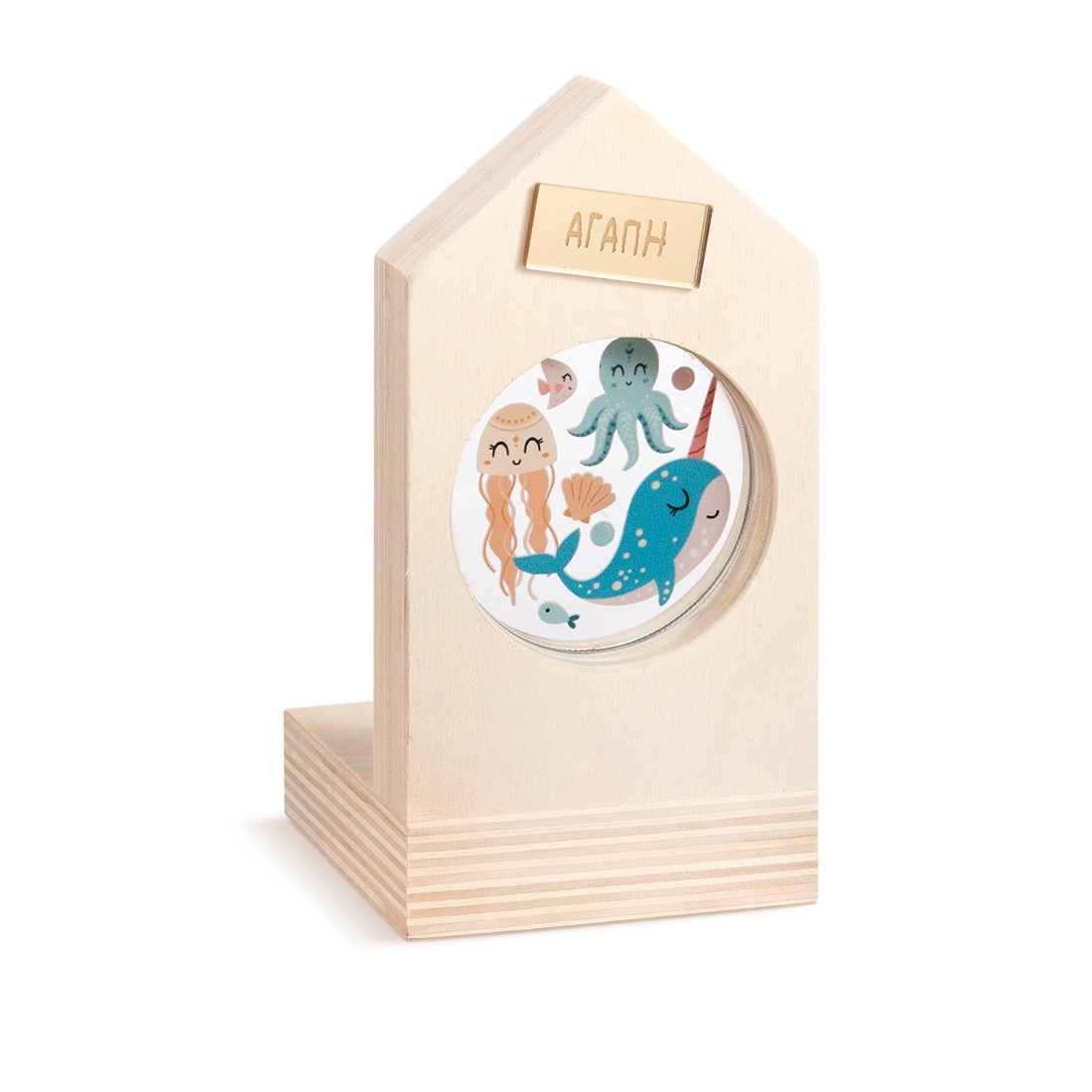 Ξύλινο διακοσμητικό σπιτάκι με ρεσώ.Το σπιτάκι είναι διακοσμημένο με στρογγυλό print plexiglass σε διάφανο χρώμα.Η παράσταση απεικονίζει τον βυθό με την φάλαινα,το χταπόδι, την μέδουσα.