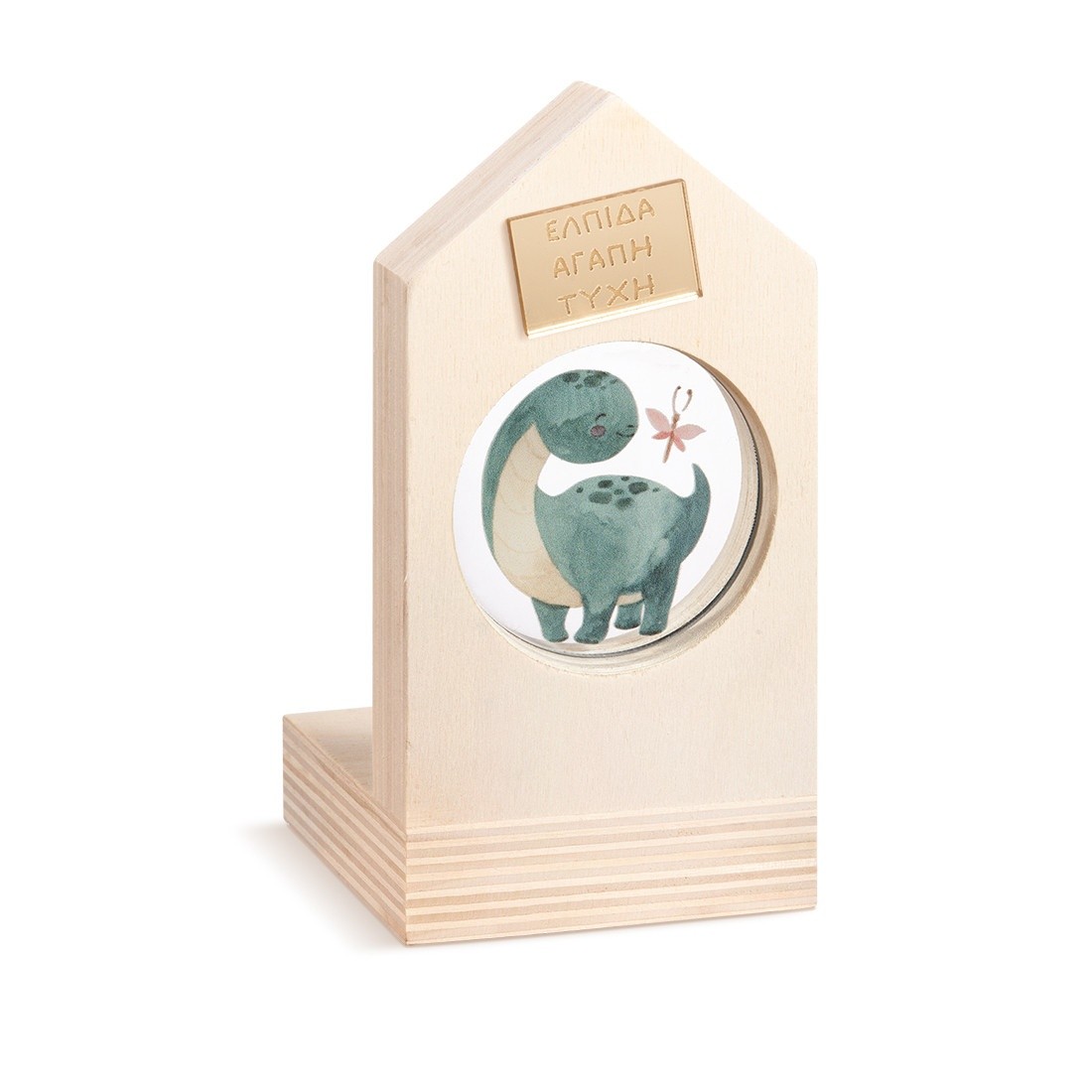 Ξύλινο διακοσμητικό σπιτάκι με ρεσώ.Το σπιτάκι είναι διακοσμημένο με στρογγυλό print plexiglass σε διάφανο χρώμα.Η παράσταση απεικονίζει έναν κυπαρισσί δεινόσαυρο.