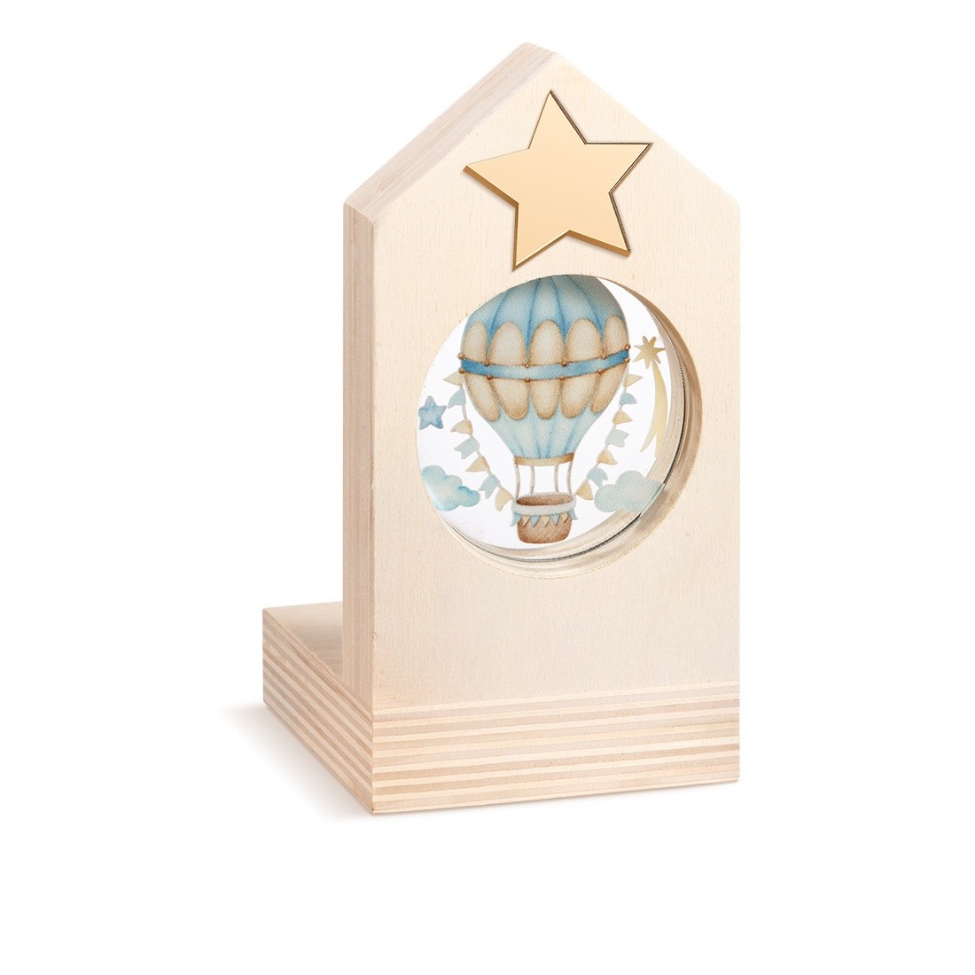 Ξύλινο διακοσμητικό σπιτάκι με ρεσώ.Το σπιτάκι είναι διακοσμημένο με στρογγυλό print plexiglass σε διάφανο χρώμα.Η παράσταση απεικονίζει το σιελ αερόστατο.