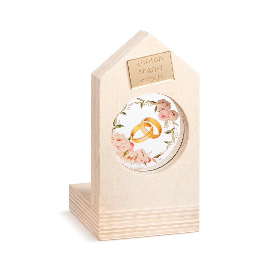 Ξύλινο διακοσμητικό σπιτάκι με ρεσώ.Το σπιτάκι είναι διακοσμημένο με στρογγυλό print plexiglass σε διάφανο χρώμα.Η παράσταση απεικονίζει τις χρυσές βέρες μέσα σε ένα στεφανάκι από ροζ παιώνια.