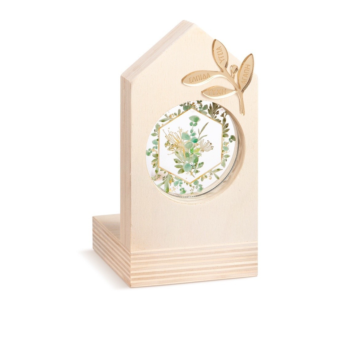 Ξύλινο διακοσμητικό σπιτάκι με ρεσώ.Το σπιτάκι είναι διακοσμημένο με στρογγυλό print plexiglass σε διάφανο χρώμα.Η παράσταση απεικονίζει ένα μπουκέτο από πράσινο ευκάλυπτο μέσα σε ένα στεφανάκι με γεωμετρικό μοτίβο.