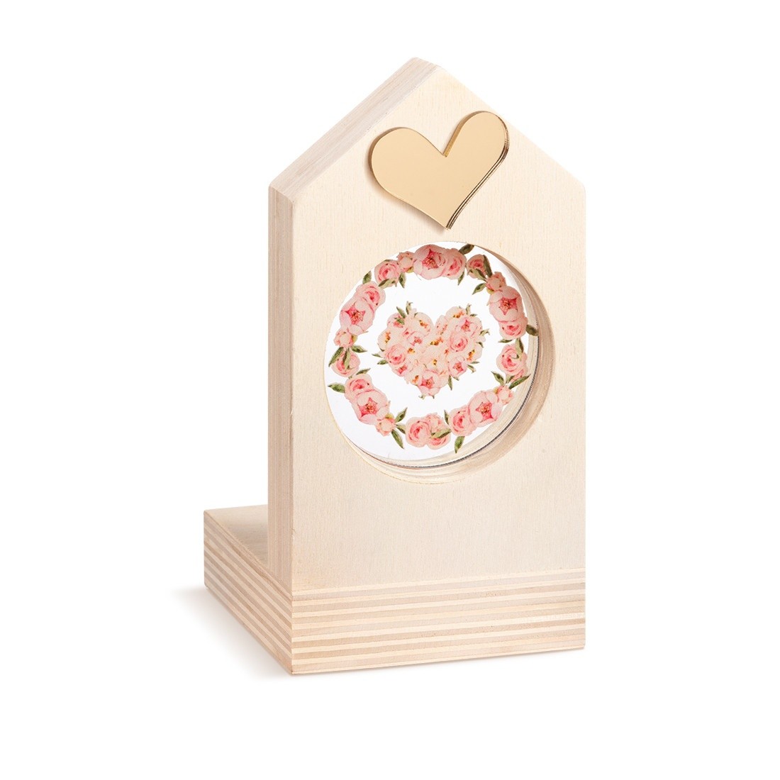Ξύλινο διακοσμητικό σπιτάκι με ρεσώ.Το σπιτάκι είναι διακοσμημένο με στρογγυλό print plexiglass σε διάφανο χρώμα.Η παράσταση απεικονίζει ένα μπουκέτο σε χήμα καρδιάς από ροζ παιώνια.