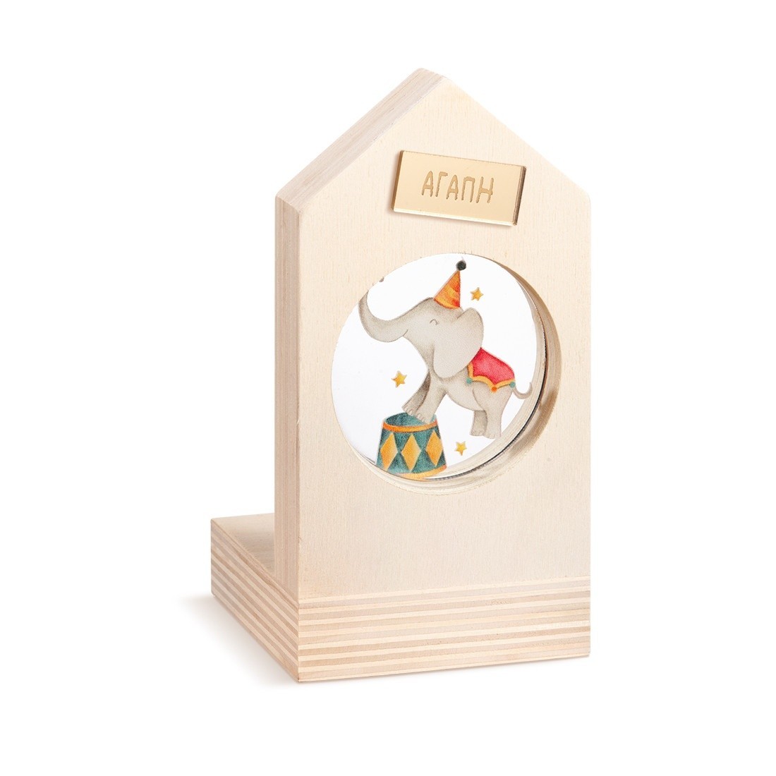 Ξύλινο διακοσμητικό σπιτάκι με ρεσώ.Το σπιτάκι είναι διακοσμημένο με στρογγυλό print plexiglass σε διάφανο χρώμα.Η παράσταση απεικονίζει τον ελέφαντα να κάνει ακροβατικά στο τσίρκο.