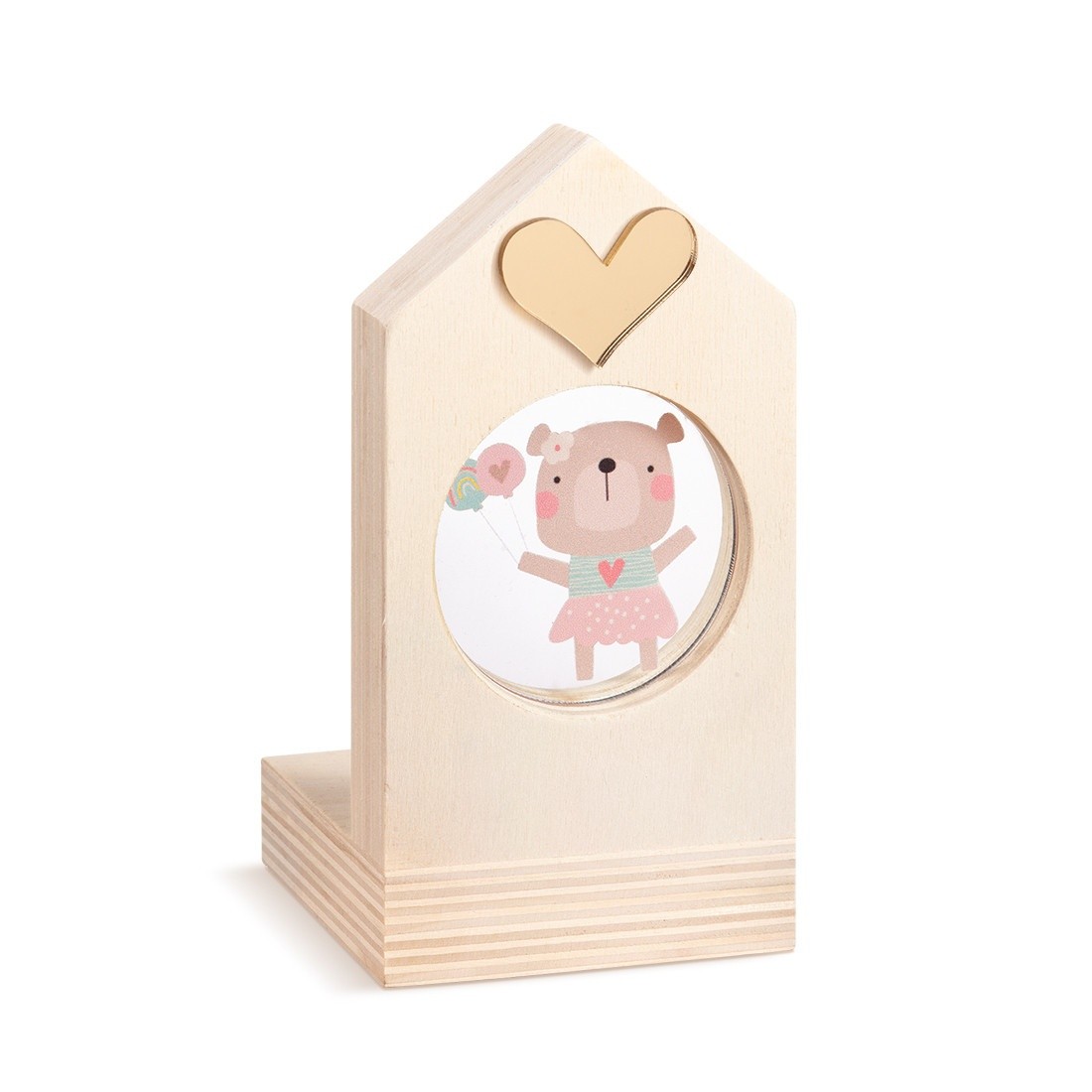 Ξύλινο διακοσμητικό σπιτάκι με ρεσώ.Το σπιτάκι είναι διακοσμημένο με στρογγυλό print plexiglass σε διάφανο χρώμα.Η παράσταση απεικονίζει την αρκουδίτσα να κρατάει μπαλόνια σε ροζ αποχρώσεις.