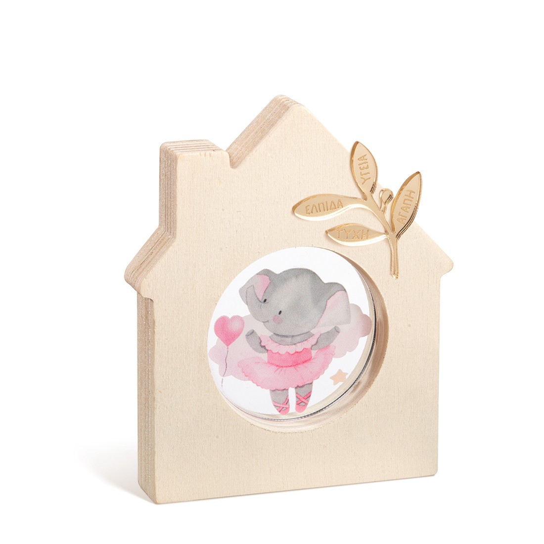 Ξύλινο διακοσμητικό σπιτάκι με καμινάδα και στρογγυλή εσοχή. Στο κέντρο είναι διακοσμημένο με στρογγυλό print plexiglass σε διάφανο χρώμα. Η παράσταση απεικονίζει την ελεφαντίνα-μπαλαρίνα σε ροζ αποχρώσεις .