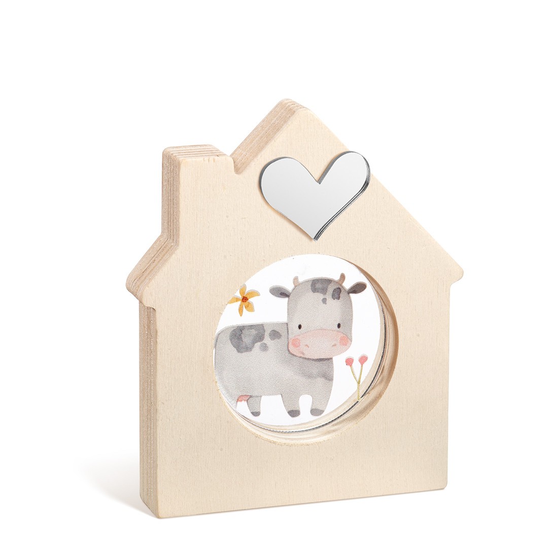 Ξύλινο διακοσμητικό σπιτάκι με καμινάδα και στρογγυλή εσοχή. Στο κέντρο είναι διακοσμημένο με στρογγυλό print plexiglass σε διάφανο χρώμα. Η παράσταση απεικονίζει μια αγελαδίτσα .