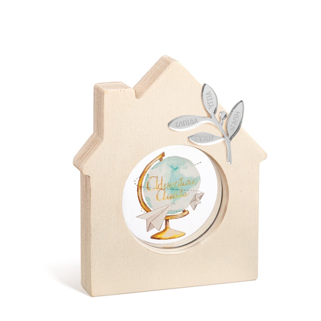 Ξύλινο διακοσμητικό σπιτάκι με καμινάδα και στρογγυλή εσοχή. Στο κέντρο είναι διακοσμημένο με στρογγυλό print plexiglass σε διάφανο χρώμα. Η παράσταση απεικονίζει την υδρόγειο και μότο "adventure awaits" . .