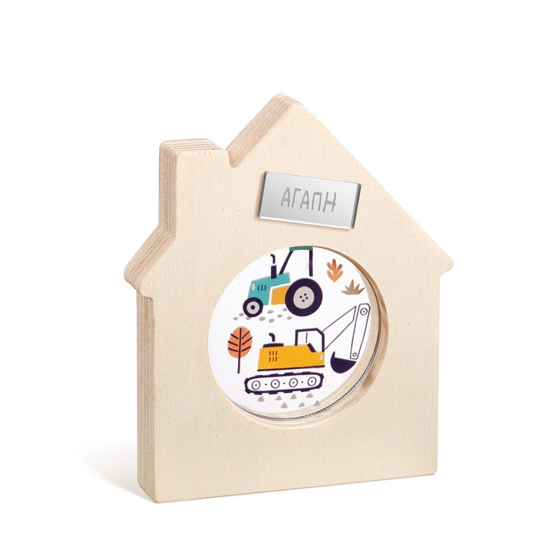 Ξύλινο διακοσμητικό σπιτάκι με καμινάδα και στρογγυλή εσοχή. Στο κέντρο είναι διακοσμημένο με στρογγυλό print plexiglass σε διάφανο χρώμα. Η παράσταση απεικονίζει τον εκσκαφέα και το τρακτέρ.