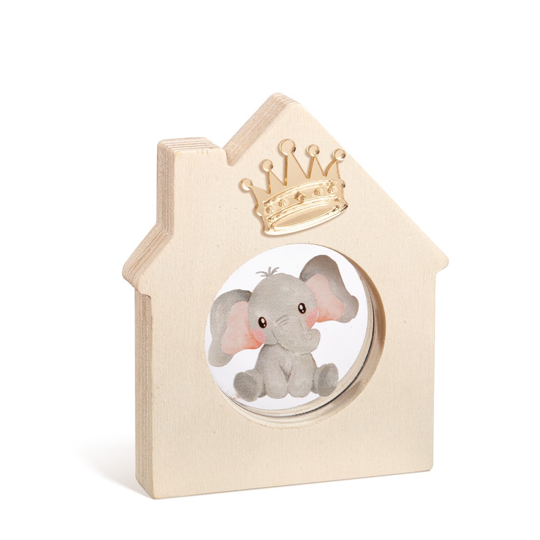 Ξύλινο διακοσμητικό σπιτάκι με καμινάδα και στρογγυλή εσοχή. Στο κέντρο είναι διακοσμημένο με στρογγυλό print plexiglass σε διάφανο χρώμα. Η παράσταση απεικονίζει το baby ελεφαντάκι .