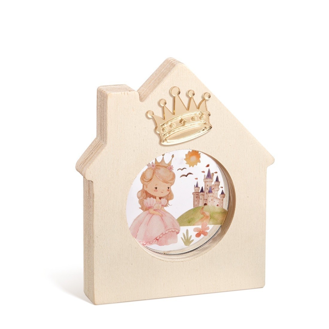 Ξύλινο διακοσμητικό σπιτάκι με καμινάδα και στρογγυλή εσοχή. Στο κέντρο είναι διακοσμημένο με στρογγυλό print plexiglass σε διάφανο χρώμα. Η παράσταση απεικονίζει την πριγκίπισσα με φόντο το κάστρο του παραμυθιού .