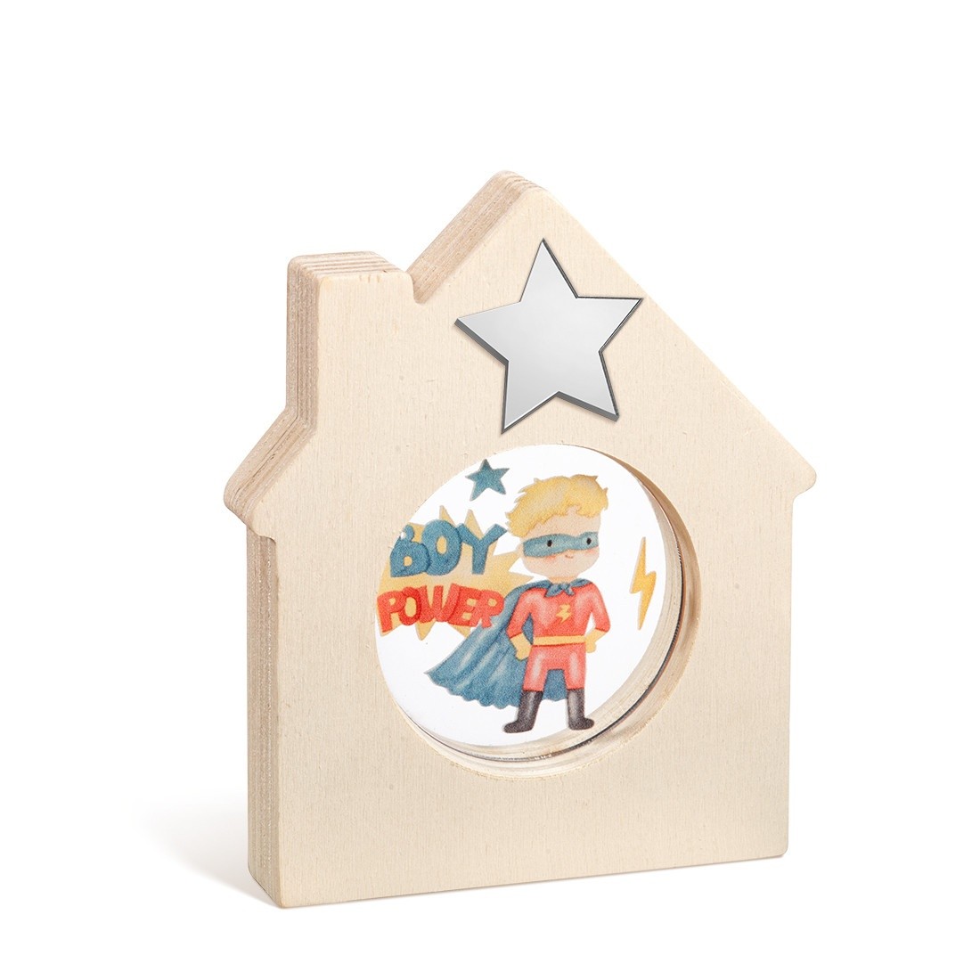 Ξύλινο διακοσμητικό σπιτάκι με καμινάδα και στρογγυλή εσοχή. Στο κέντρο είναι διακοσμημένο με στρογγυλό print plexiglass σε διάφανο χρώμα. Η παράσταση απεικονίζει τον superhero boy .