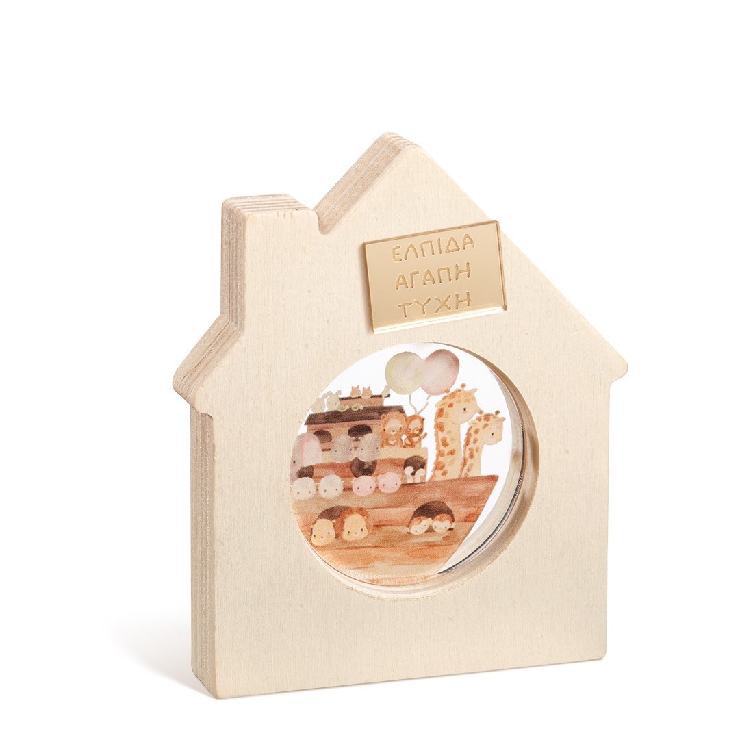 Ξύλινο διακοσμητικό σπιτάκι με καμινάδα και στρογγυλή εσοχή. Στο κέντρο είναι διακοσμημένο με στρογγυλό print plexiglass σε διάφανο χρώμα. Η παράσταση απεικονίζει την κιβωτό με τα ζωάκια .