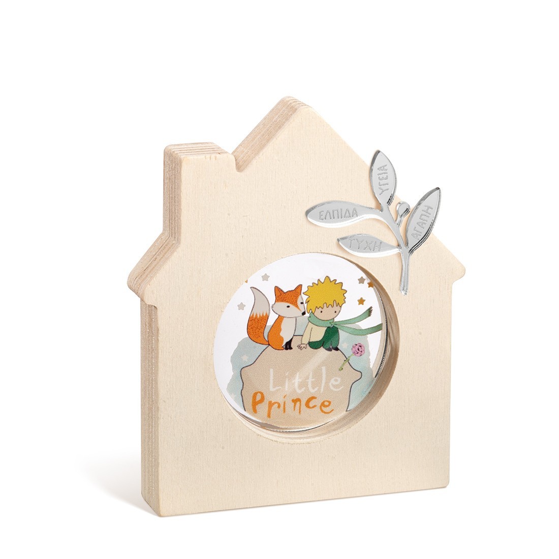 Ξύλινο διακοσμητικό σπιτάκι με καμινάδα και στρογγυλή εσοχή. Στο κέντρο είναι διακοσμημένο με στρογγυλό print plexiglass σε διάφανο χρώμα. Η παράσταση απεικονίζει τον Little Prince .