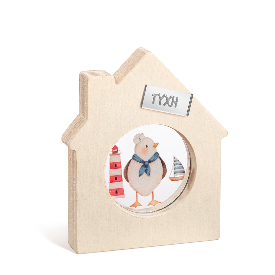 Ξύλινο διακοσμητικό σπιτάκι με καμινάδα και στρογγυλή εσοχή. Στο κέντρο είναι διακοσμημένο με στρογγυλό print plexiglass σε διάφανο χρώμα. Η παράσταση απεικονίζει τον γλάρο ναυτάκι.