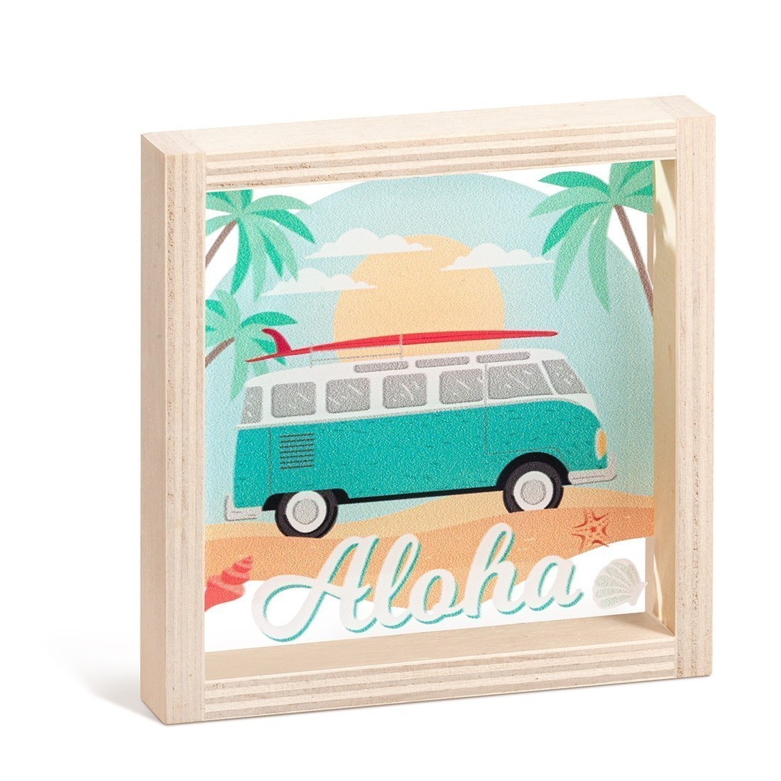 Ξύλινο καδράκι με print plexiglass παράσταση.Η παράσταση απεικονίζει σε διάφανο χρώμα ένα βεραμάν van ALOHA .