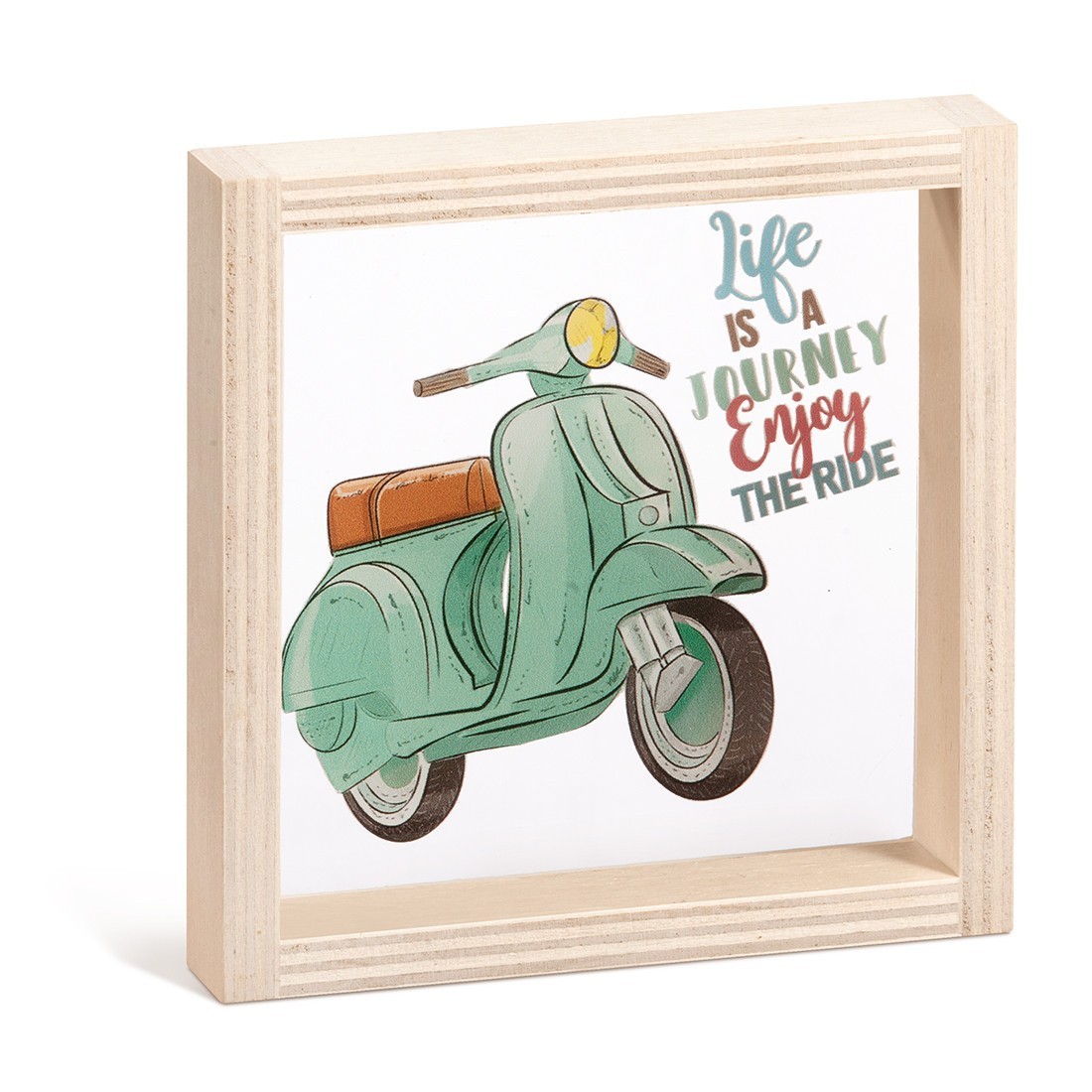 Ξύλινο καδράκι με print plexiglass παράσταση.Η παράσταση απεικονίζει σε διάφανο χρώμα τη βεραμάν βέσπα και moto "Life is a journey, enjoy the ride".