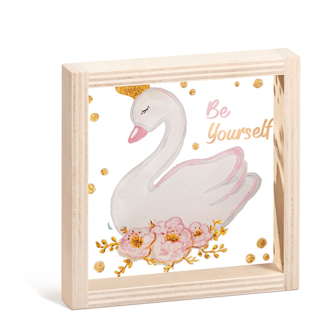 Ξύλινο καδράκι με print plexiglass παράσταση.Η παράσταση απεικονίζει σε διάφανο χρώμα τον κύκνο .