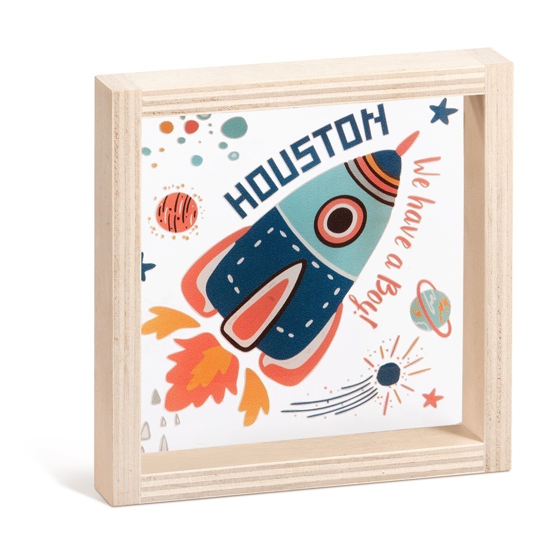 Ξύλινο καδράκι με print plexiglass παράσταση.Η παράσταση απεικονίζει σε διάφανο χρώμα τον πύραυλο να απογειώνεται και moto "Houston we have a boy".