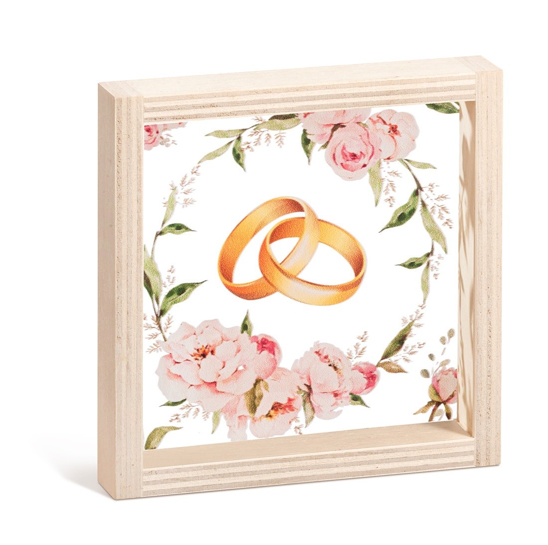 Ξύλινο καδράκι με print plexiglass παράσταση.Η παράσταση απεικονίζει σε διάφανο χρώμα τις χρυσές βέρες μέσα σε ένα στεφανάκι από ροζ παιώνια.