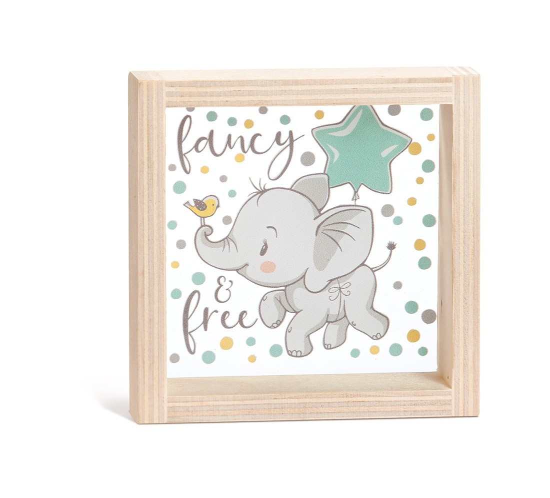 Ξύλινο καδράκι με print plexiglass παράσταση.Η παράσταση απεικονίζει σε διάφανο χρώμα το ελεφαντάκι με το μπαλόνι να είναι fancy & free.