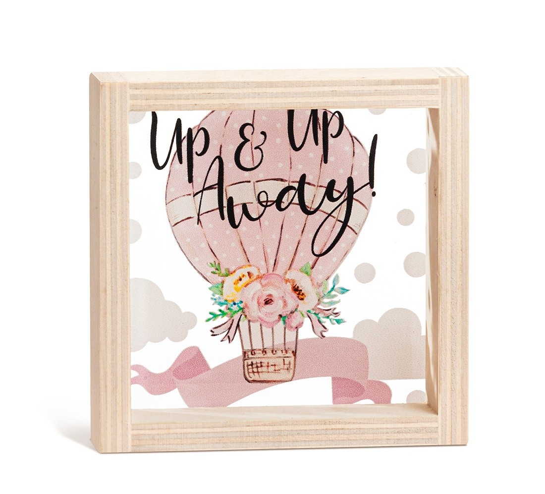 Ξύλινο καδράκι με print plexiglass παράσταση.Η παράσταση απεικονίζει σε διάφανο χρώμα το αερόστατο σε ροζ χρώμα και moto "up, up & away".