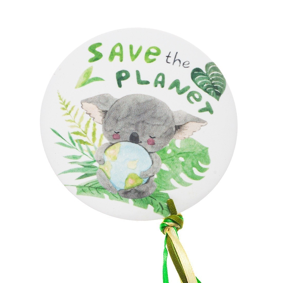 Σουβέρ σε στρογγυλό σχήμα με print plexiglass παράσταση σε λευκό χρώμα. Η παράσταση απεικονίζει το κοάλα αγκαλιά με την υδρόγειο να στέλνει το μήνυμα "Save the Planet" .