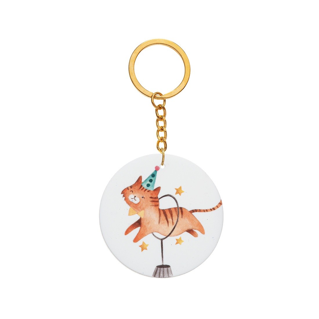 Μπρελόκ με στρογγυλή print παράσταση από plexiglass σε λευκό χρώμα. Η παράσταση απεικονίζει την τίγρη να κάνει ακροβατικά στο τσίρκο.