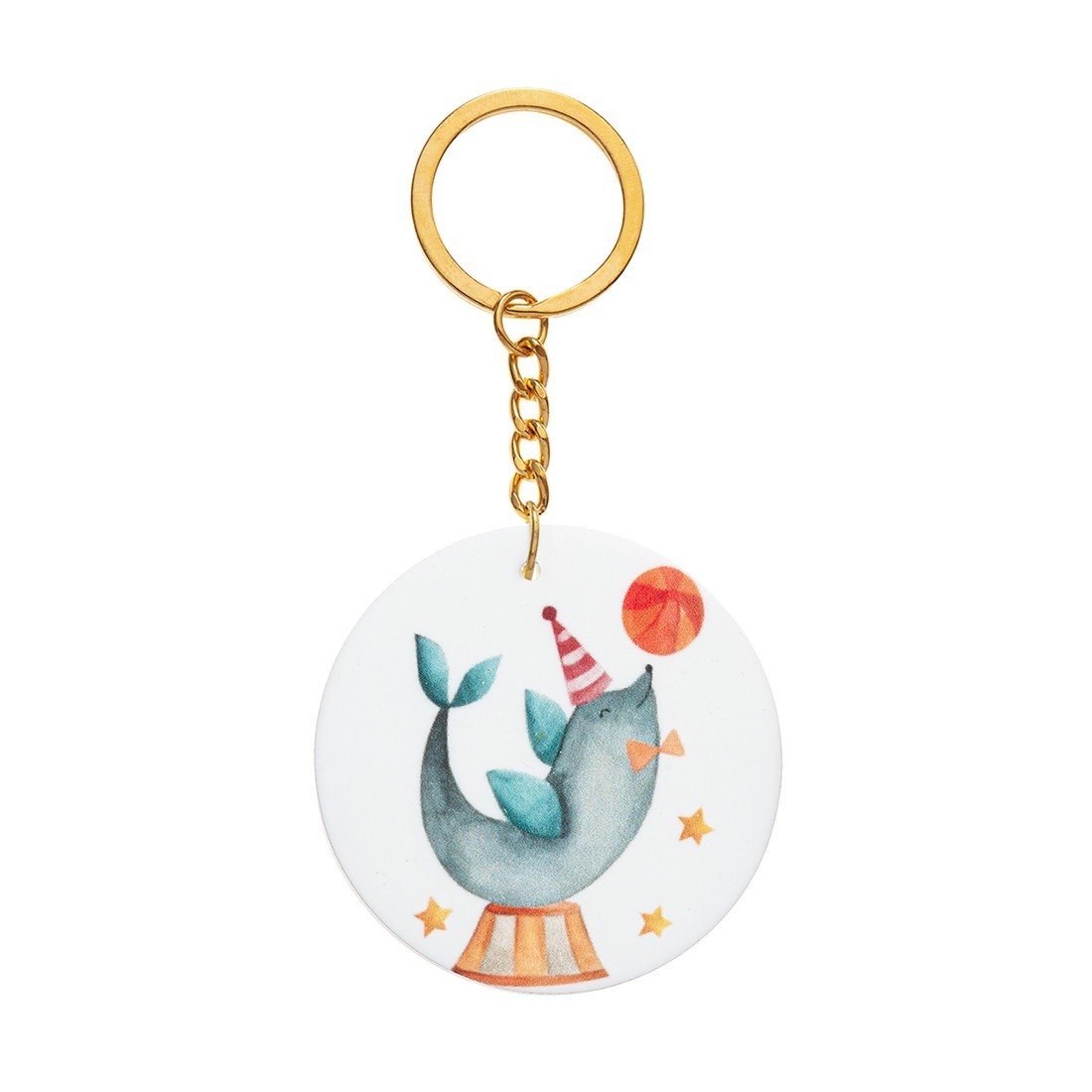 Μπρελόκ με στρογγυλή print παράσταση από plexiglass σε λευκό χρώμα. Η παράσταση απεικονίζει το δελφίνι να κάνει ακροβατικά στο τσίρκο.