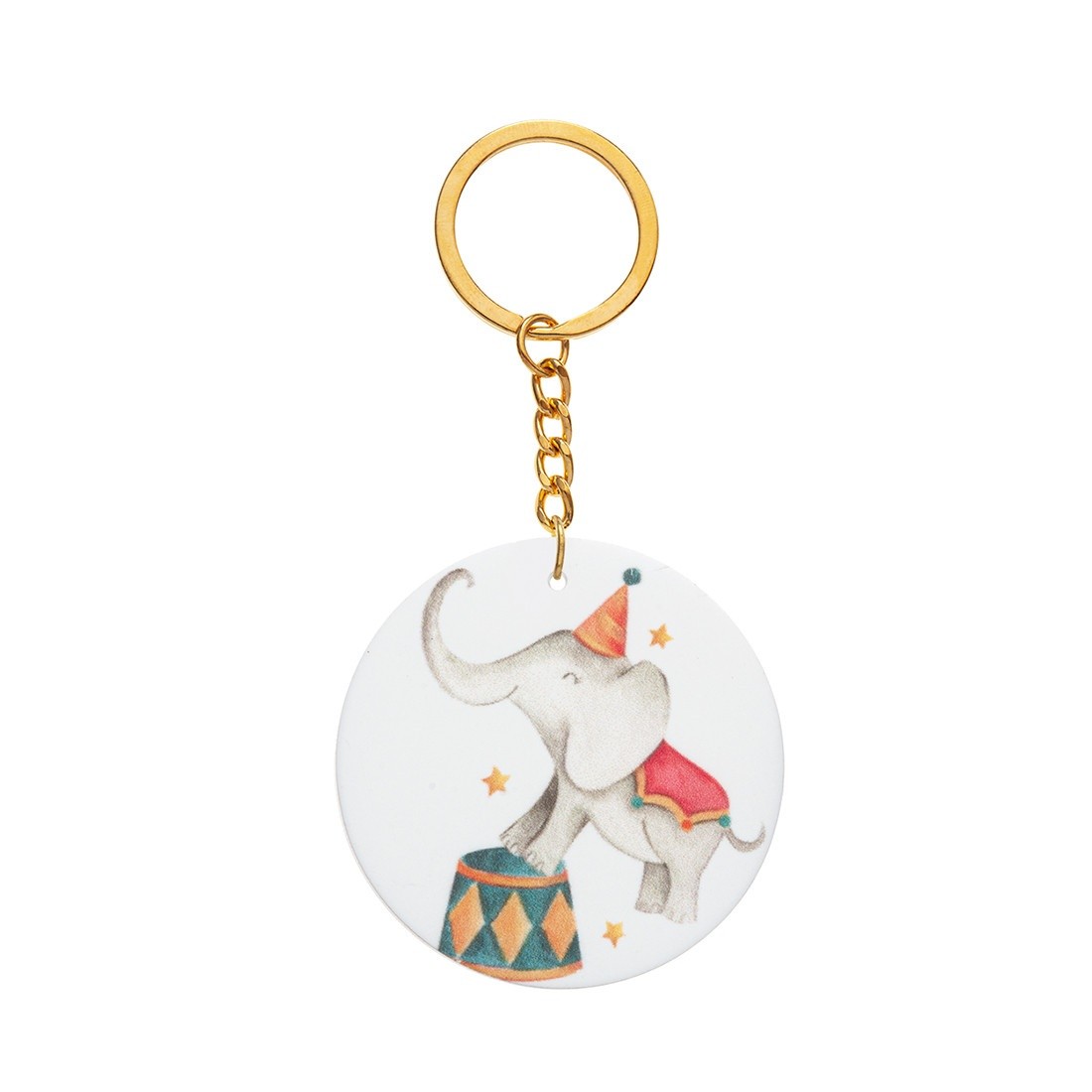 Μπρελόκ με στρογγυλή print παράσταση από plexiglass σε λευκό χρώμα. Η παράσταση απεικονίζει τον ελέφαντα να κάνει ακροβατικά στο τσίρκο.