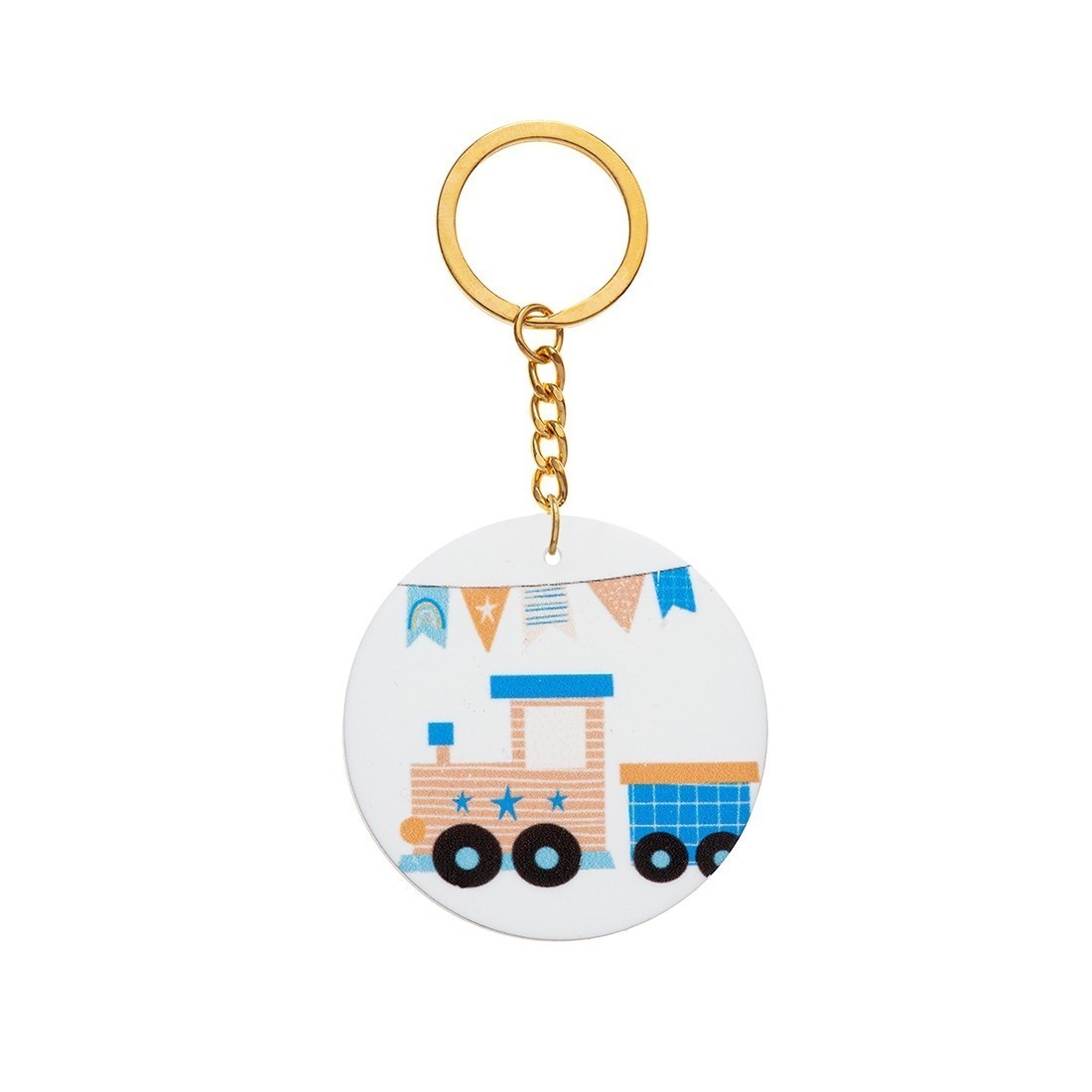 Μπρελόκ με στρογγυλή print παράσταση από plexiglass σε λευκό χρώμα. Η παράσταση απεικονίζει το τρενάκι σε σιέλ αποχρώσεις .