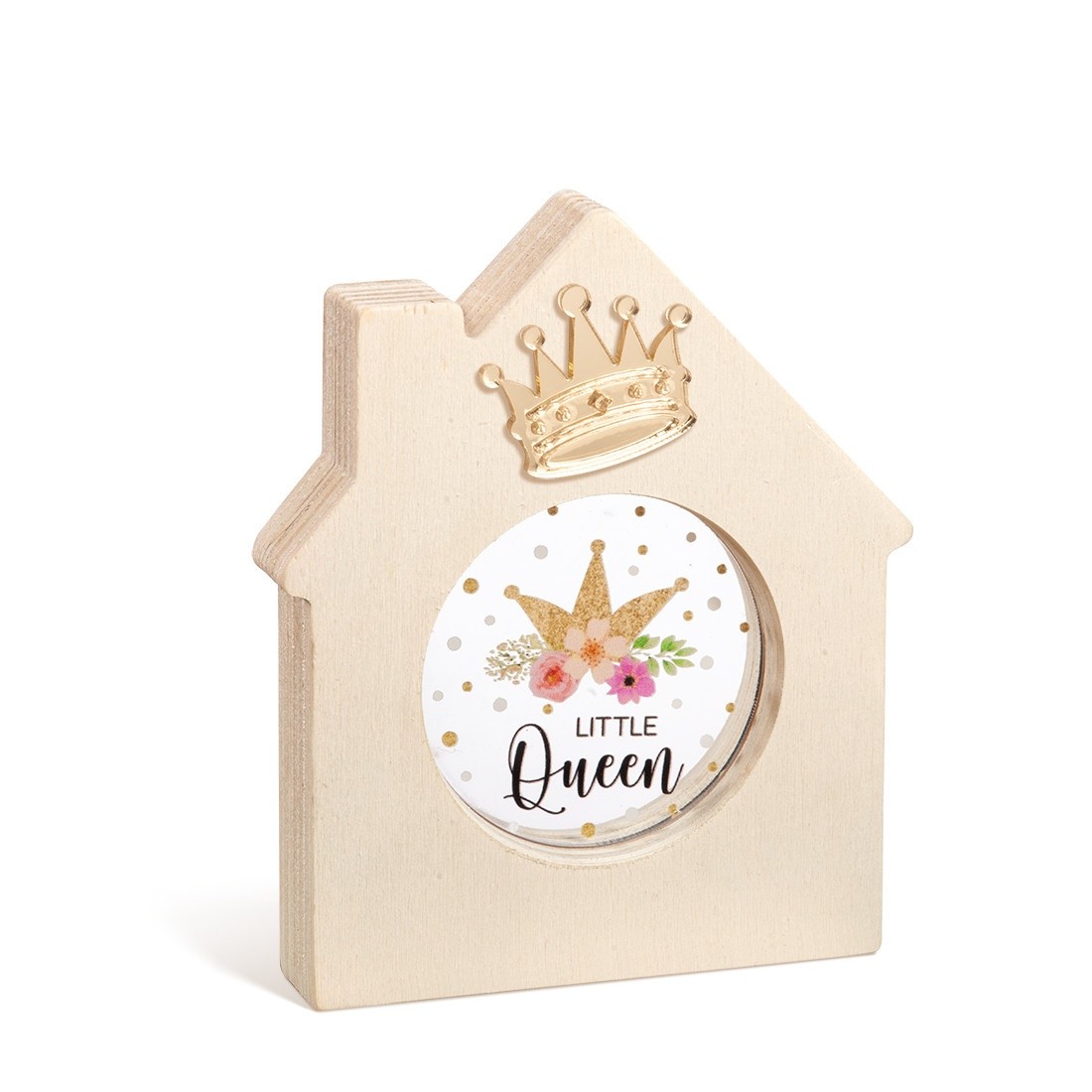 Ξύλινο διακοσμητικό σπιτάκι με καμινάδα και στρογγυλή εσοχή. Στο κέντρο είναι διακοσμημένο με στρογγυλό print plexiglass σε διάφανο χρώμα. Η παράσταση απεικονίζει το στέμμα της Little Queen .
