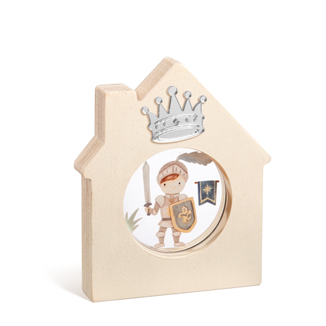 Ξύλινο διακοσμητικό σπιτάκι με καμινάδα και στρογγυλή εσοχή. Στο κέντρο είναι διακοσμημένο με στρογγυλό print plexiglass σε διάφανο χρώμα. Η παράσταση απεικονίζει τον ιππότη του παραμυθιού.