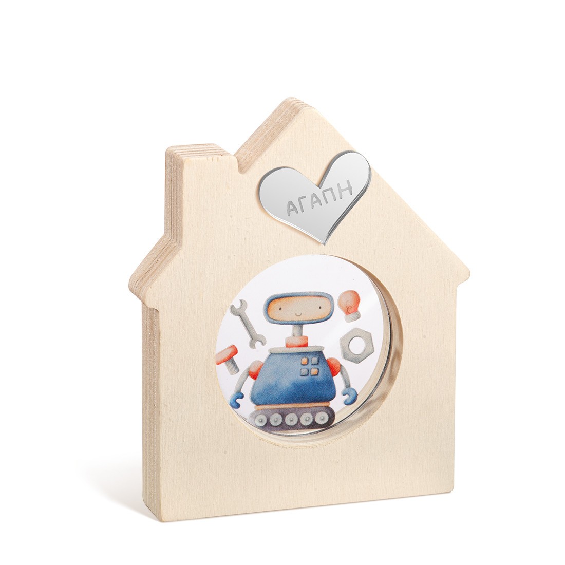 Ξύλινο διακοσμητικό σπιτάκι με καμινάδα και στρογγυλή εσοχή. Στο κέντρο είναι διακοσμημένο με στρογγυλό print plexiglass σε διάφανο χρώμα. Η παράσταση απεικονίζει το ρομπότ με φόντο διάφορα εργαλεία .