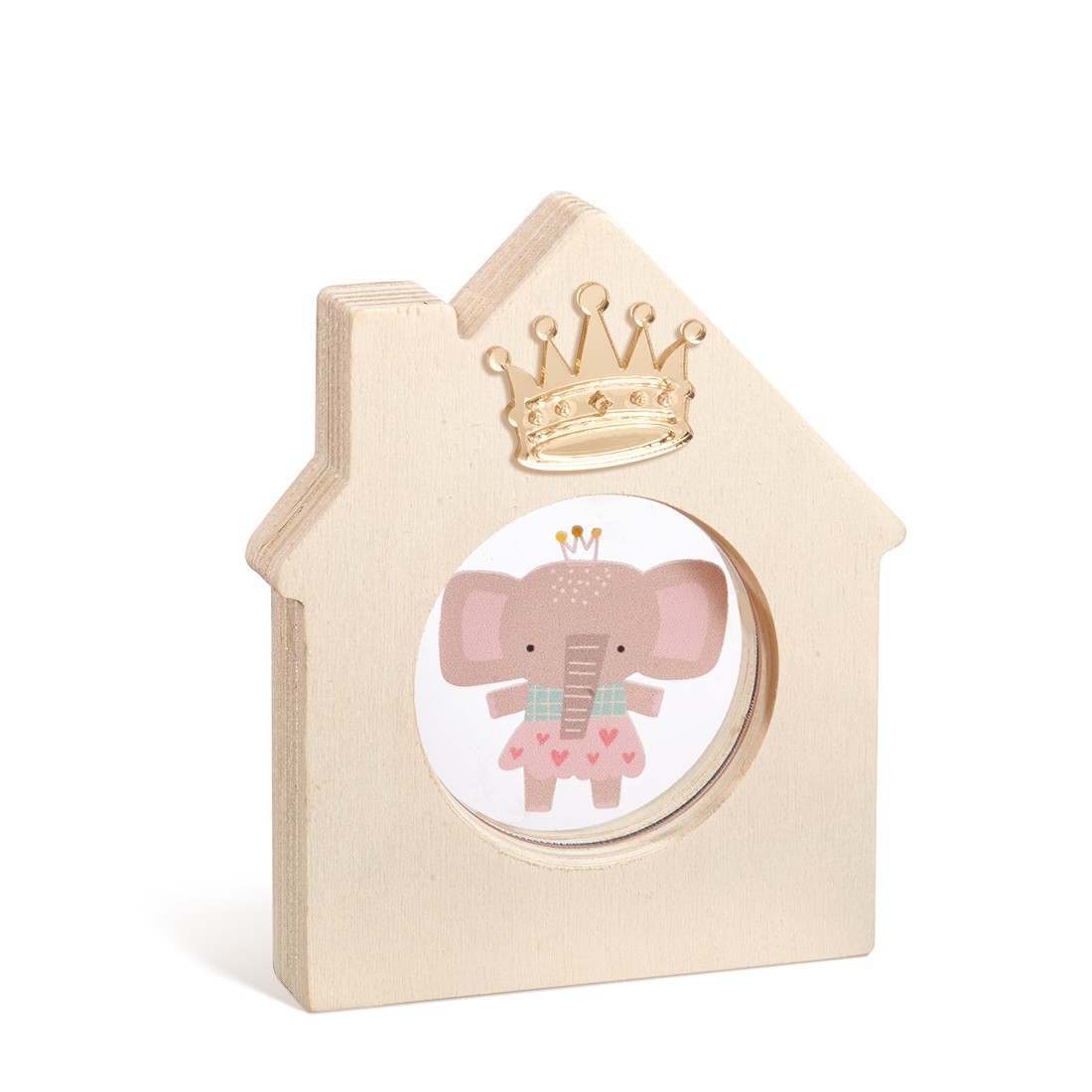 Ξύλινο διακοσμητικό σπιτάκι με καμινάδα και στρογγυλή εσοχή. Στο κέντρο είναι διακοσμημένο με στρογγυλό print plexiglass σε διάφανο χρώμα. Η παράσταση απεικονίζει την ελεφαντίνα σε ροζ αποχρώσεις.