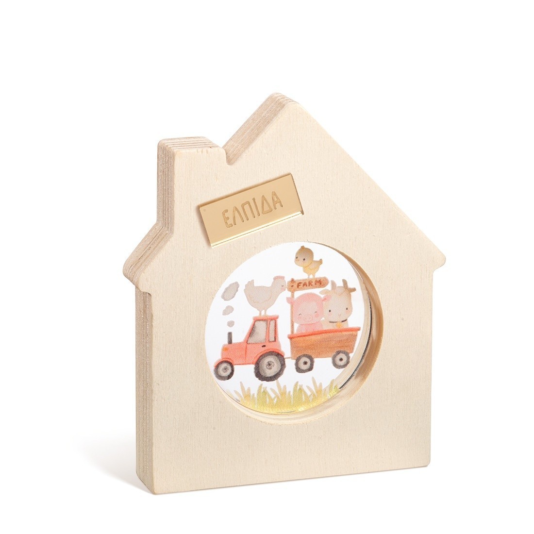 Ξύλινο διακοσμητικό σπιτάκι με καμινάδα και στρογγυλή εσοχή. Στο κέντρο είναι διακοσμημένο με στρογγυλό print plexiglass σε διάφανο χρώμα. Η παράσταση απεικονίζει ένα τρακτέρ γεμάτο ζωάκια της φάρμας.