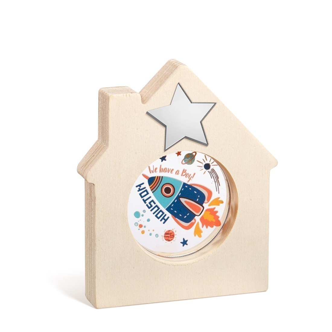 Ξύλινο διακοσμητικό σπιτάκι με καμινάδα και στρογγυλή εσοχή. Στο κέντρο είναι διακοσμημένο με στρογγυλό print plexiglass σε διάφανο χρώμα. Η παράσταση απεικονίζει τον πύραυλο και μότο "Houston we have a boy! ".