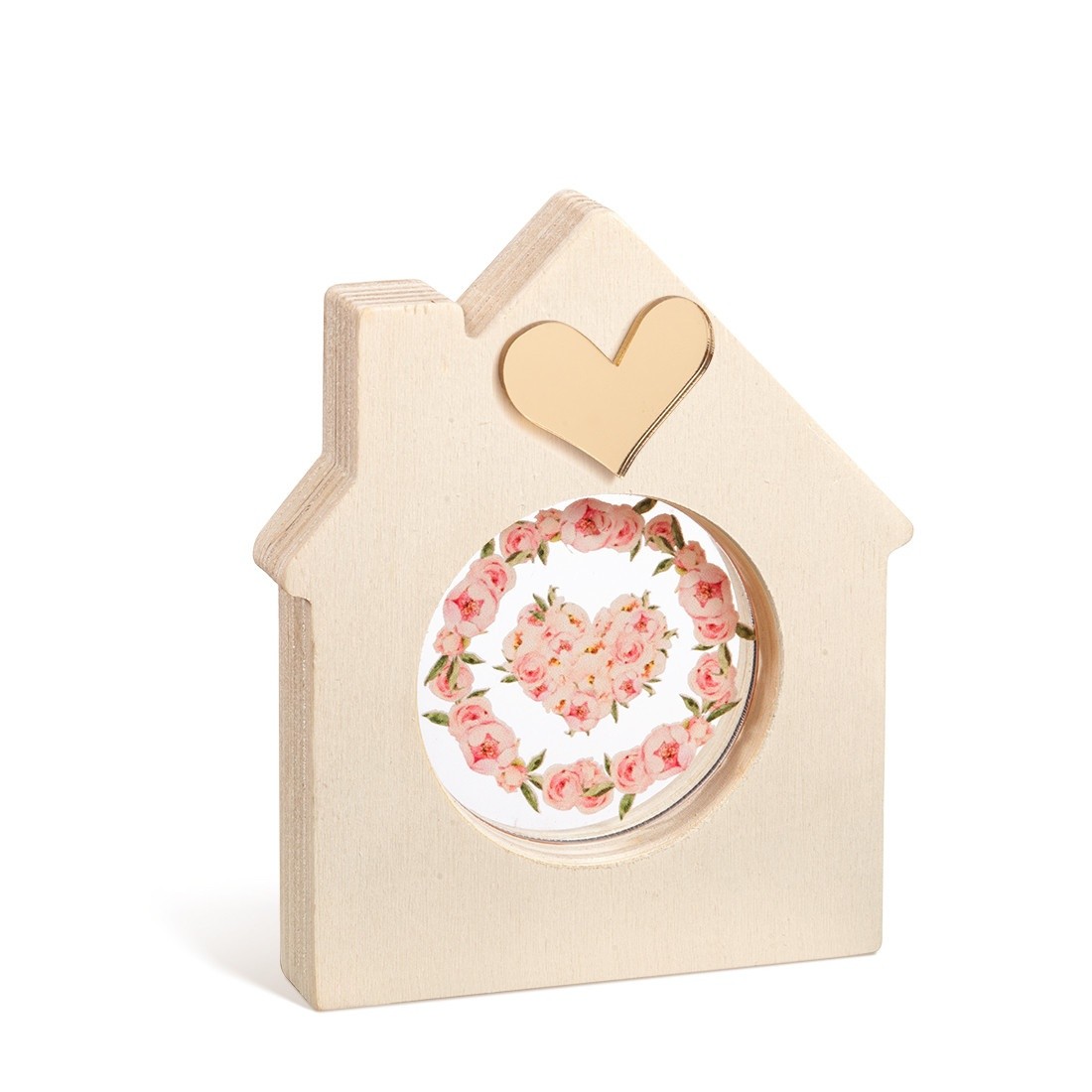 Ξύλινο διακοσμητικό σπιτάκι με καμινάδα και στρογγυλή εσοχή. Στο κέντρο είναι διακοσμημένο με στρογγυλό print plexiglass σε διάφανο χρώμα. Η παράσταση απεικονίζει ένα μπουκέτο σε σχήμα καρδιάς από ροζ παιώνια.