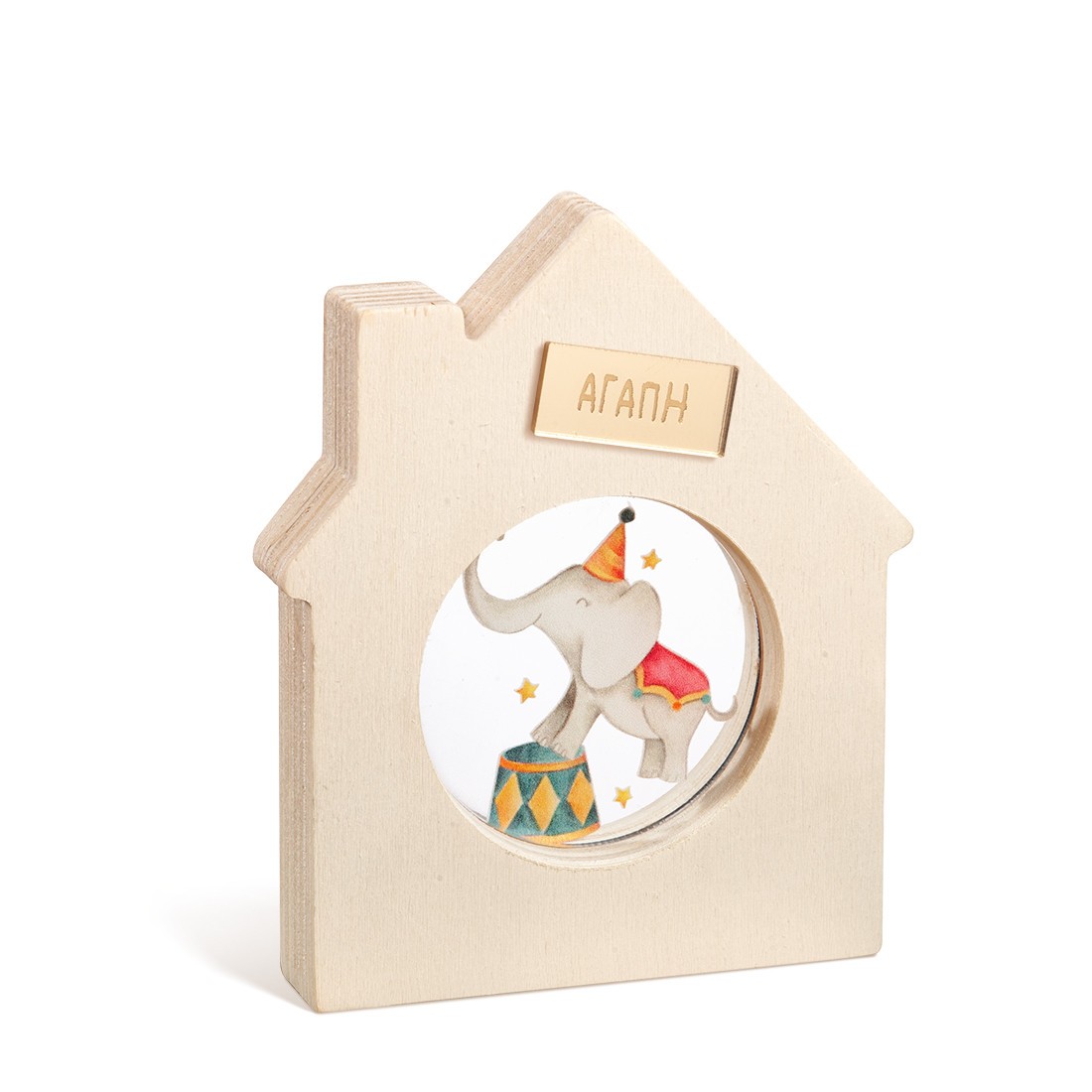 Ξύλινο διακοσμητικό σπιτάκι με καμινάδα και στρογγυλή εσοχή. Στο κέντρο είναι διακοσμημένο με στρογγυλό print plexiglass σε διάφανο χρώμα. Η παράσταση απεικονίζει τον ελέφαντα ακροβάτη στο τσίρκο.