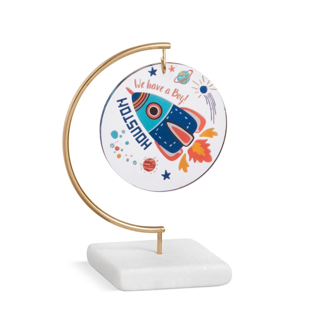 Διακοσμητική μπομπονιέρα με σύνθεση τριών υλικών.Η σύνθεση αποτελείται από : α) στρογγυλή print plexiglass παράσταση σε διάφανο χρώμα β) μεταλλικό κρίκο σε χρυσό χρώμα γ)βάση. Η παράσταση απεικονίζει τον πύραυλο να απογειώνεται και moto "Houston we have a boy" .