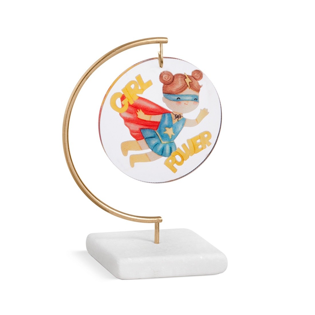 Διακοσμητική μπομπονιέρα με σύνθεση τριών υλικών.Η σύνθεση αποτελείται από : α) στρογγυλή print plexiglass παράσταση σε διάφανο χρώμα β) μεταλλικό κρίκο σε χρυσό χρώμα γ)βάση. Η παράσταση απεικονίζει την Super Girl power .