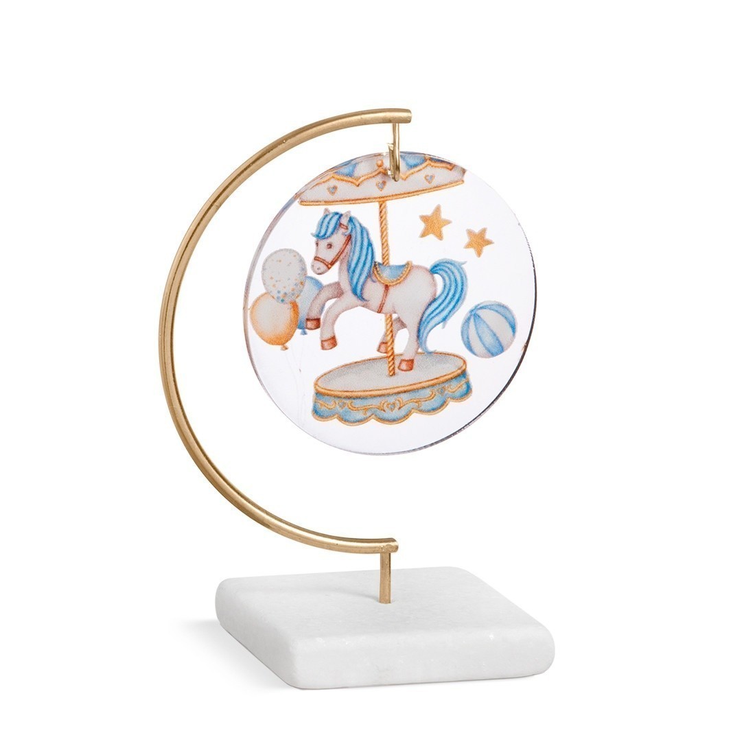 Διακοσμητική μπομπονιέρα με σύνθεση τριών υλικών.Η σύνθεση αποτελείται από : α) στρογγυλή print plexiglass παράσταση σε διάφανο χρώμα β) μεταλλικό κρίκο σε χρυσό χρώμα γ)βάση. Η παράσταση απεικονίζει ένα καρουζέλ σιελ .