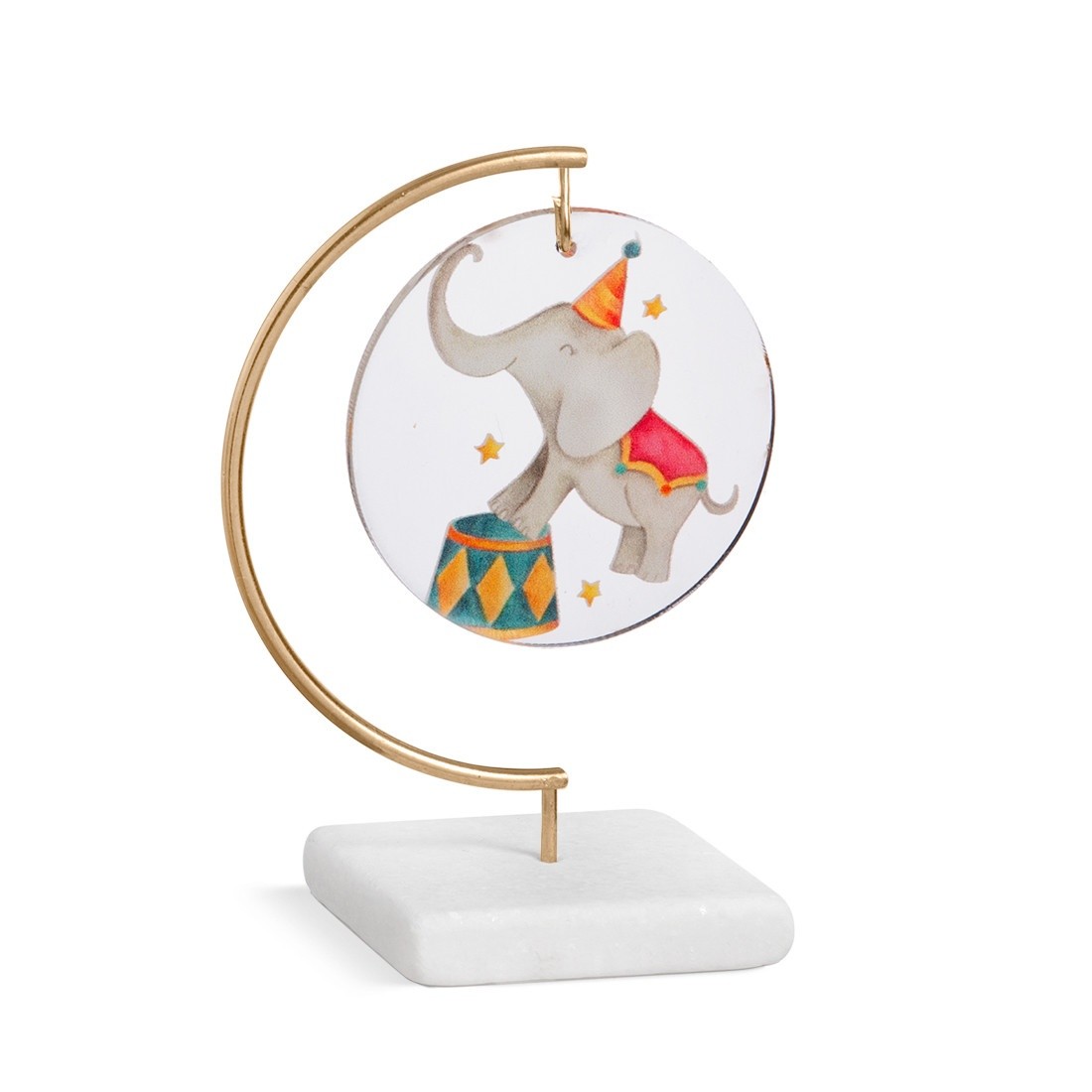 Διακοσμητική μπομπονιέρα με σύνθεση τριών υλικών.Η σύνθεση αποτελείται από : α) στρογγυλή print plexiglass παράσταση σε διάφανο χρώμα β) μεταλλικό κρίκο σε χρυσό χρώμα γ)βάση. Η παράσταση απεικονίζει τον ελέφαντα να κάνει ακροβατικά στο τσίρκο .
