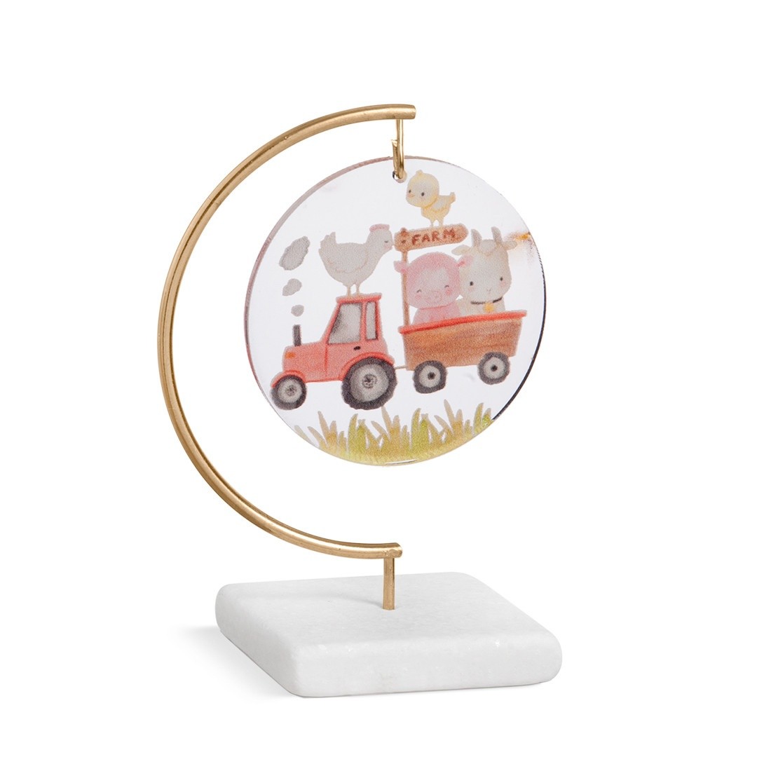 Διακοσμητική μπομπονιέρα με σύνθεση τριών υλικών.Η σύνθεση αποτελείται από : α) στρογγυλή print plexiglass παράσταση σε διάφανο χρώμα β) μεταλλικό κρίκο σε χρυσό χρώμα γ)βάση. Η παράσταση απεικονίζει ένα τρακτέρ γεμάτο ζωάκια της φάρμας .