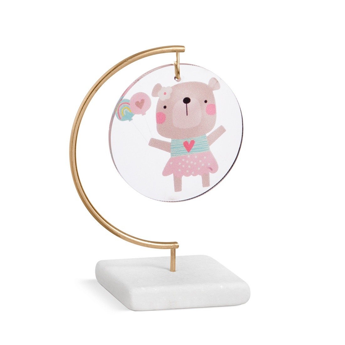 Διακοσμητική μπομπονιέρα με σύνθεση τριών υλικών.Η σύνθεση αποτελείται από : α) στρογγυλή print plexiglass παράσταση σε διάφανο χρώμα β) μεταλλικό κρίκο σε χρυσό χρώμα γ)βάση. Η παράσταση απεικονίζει τη αρκουδίνα σε ροζ αποχρώσεις .