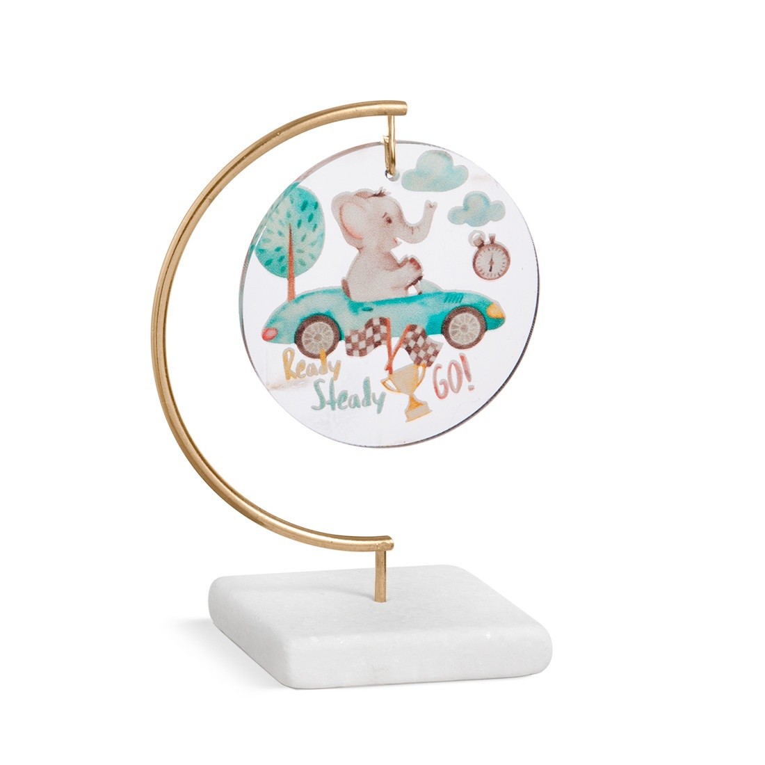 Διακοσμητική μπομπονιέρα με σύνθεση τριών υλικών.Η σύνθεση αποτελείται από : α) στρογγυλή print plexiglass παράσταση σε διάφανο χρώμα β) μεταλλικό κρίκο σε χρυσό χρώμα γ)βάση. Η παράσταση απεικονίζει το ελεφαντάκι να συμμετέχει σε αγώνες φόρμουλας και σύνθημα "READY, STEADY, GO" .