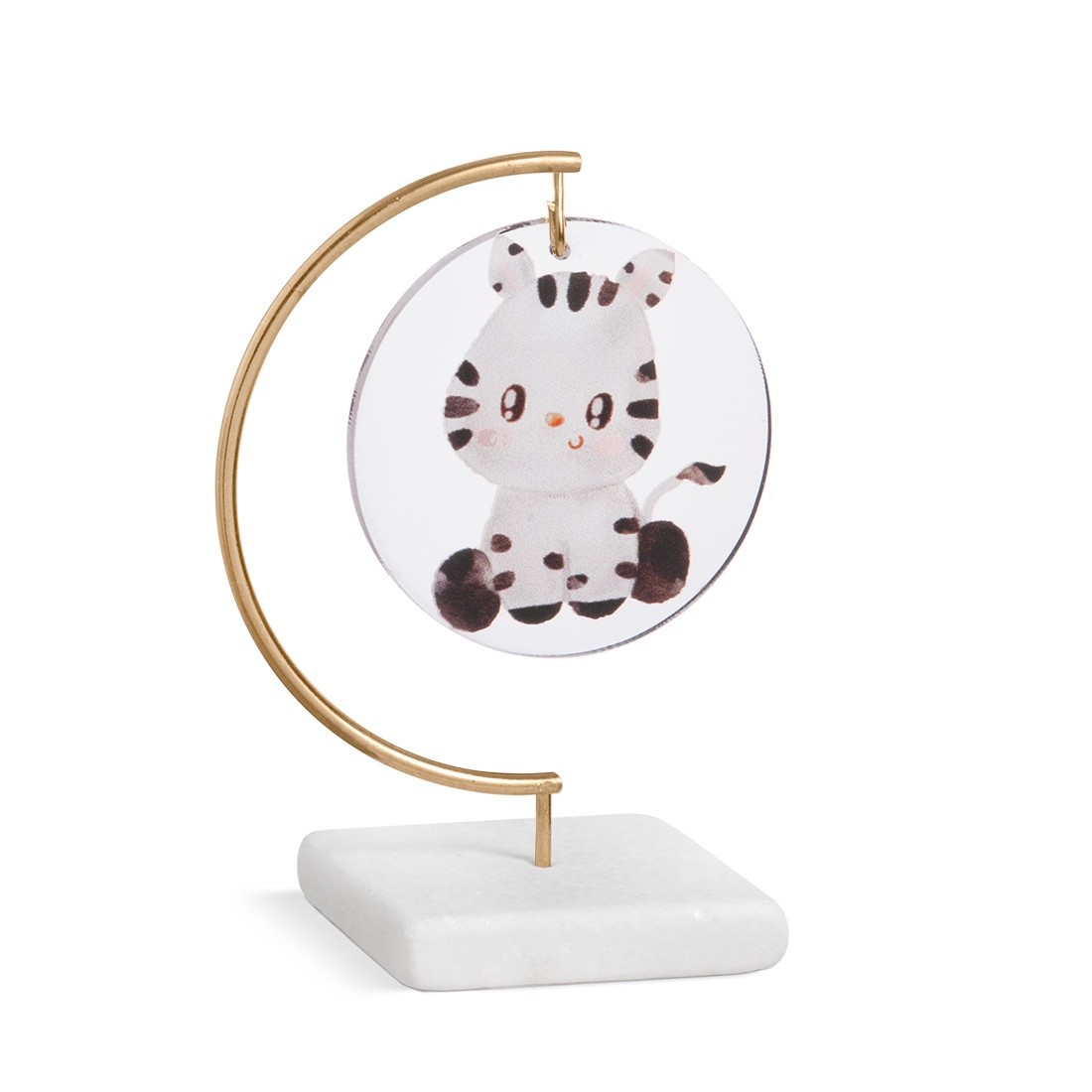 Διακοσμητική μπομπονιέρα με σύνθεση τριών υλικών.Η σύνθεση αποτελείται από : α) στρογγυλή print plexiglass παράσταση σε διάφανο χρώμα β) μεταλλικό κρίκο σε χρυσό χρώμα γ)βάση. Η παράσταση απεικονίζει μία baby ζέβρα .