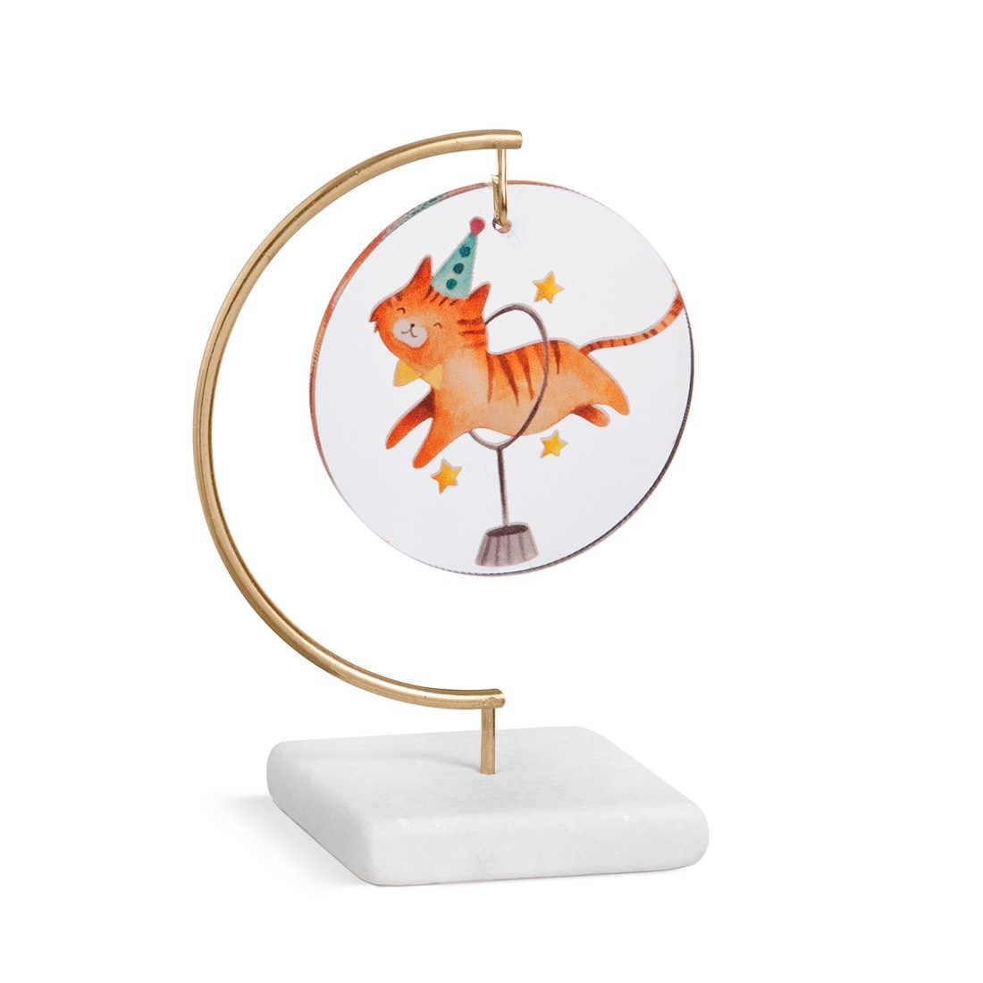 Διακοσμητική μπομπονιέρα με σύνθεση τριών υλικών.Η σύνθεση αποτελείται από : α) στρογγυλή print plexiglass παράσταση σε διάφανο χρώμα β) μεταλλικό κρίκο σε χρυσό χρώμα γ)βάση. Η παράσταση απεικονίζει την τίγρη να κάνει ακροβατικά στο τσίρκο .