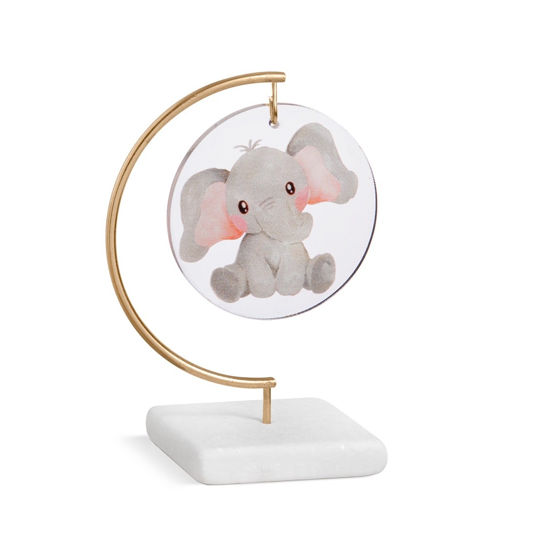 Διακοσμητική μπομπονιέρα με σύνθεση τριών υλικών.Η σύνθεση αποτελείται από : α) στρογγυλή print plexiglass παράσταση σε διάφανο χρώμα β) μεταλλικό κρίκο σε χρυσό χρώμα γ)βάση. Η παράσταση απεικονίζει ένα baby ελεφαντάκι .