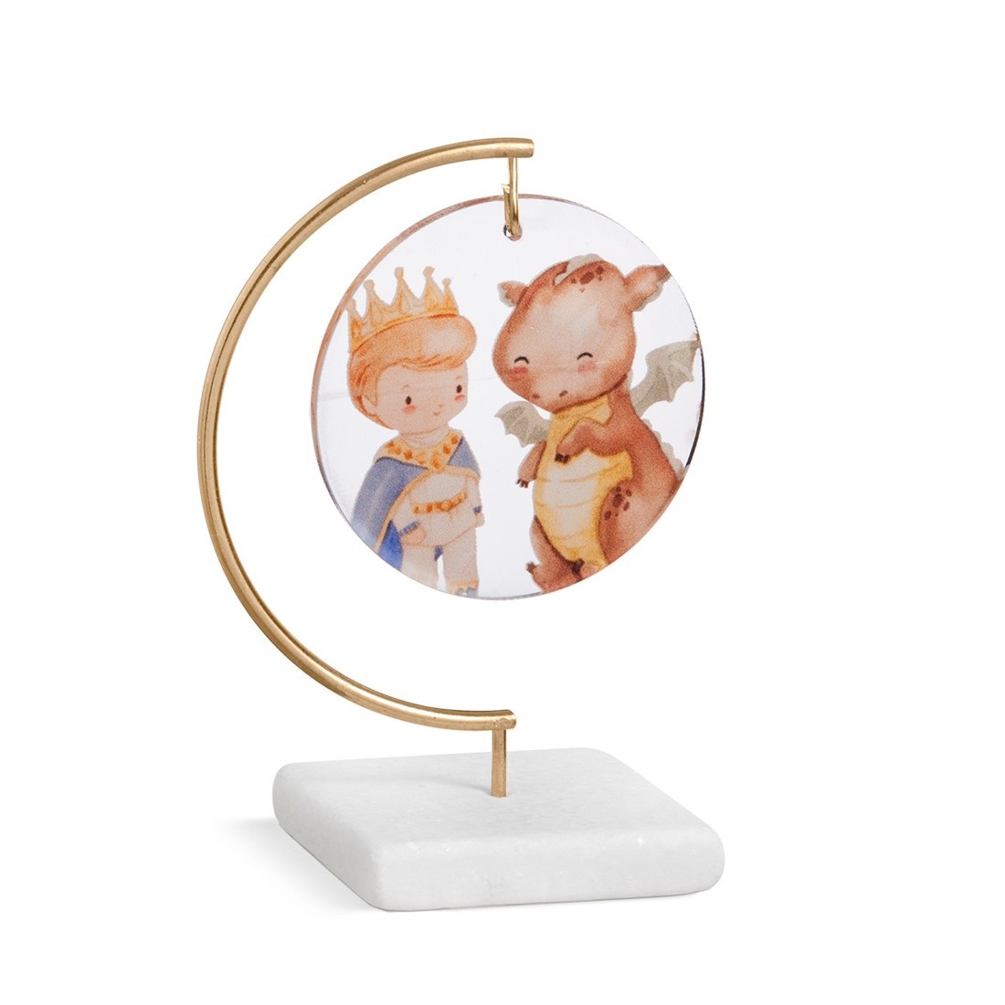 Διακοσμητική μπομπονιέρα με σύνθεση τριών υλικών.Η σύνθεση αποτελείται από : α) στρογγυλή print plexiglass παράσταση σε διάφανο χρώμα β) μεταλλικό κρίκο σε χρυσό χρώμα γ)βάση. Η παράσταση απεικονίζει τον πρίγκιππα παρέα με τον δράκο του παραμυθιού .